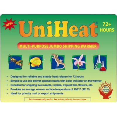 The UniHeat 72 hour heat pack (shipping warmers) is the one of the most popular heat source for any one who needs to ship reptiles, amphibians, insects, invertebrates, fish, plants and many other perishable items. They are intended to be used with an insulated box, that will be delivered in UNDER 3 days of opening the heat pack